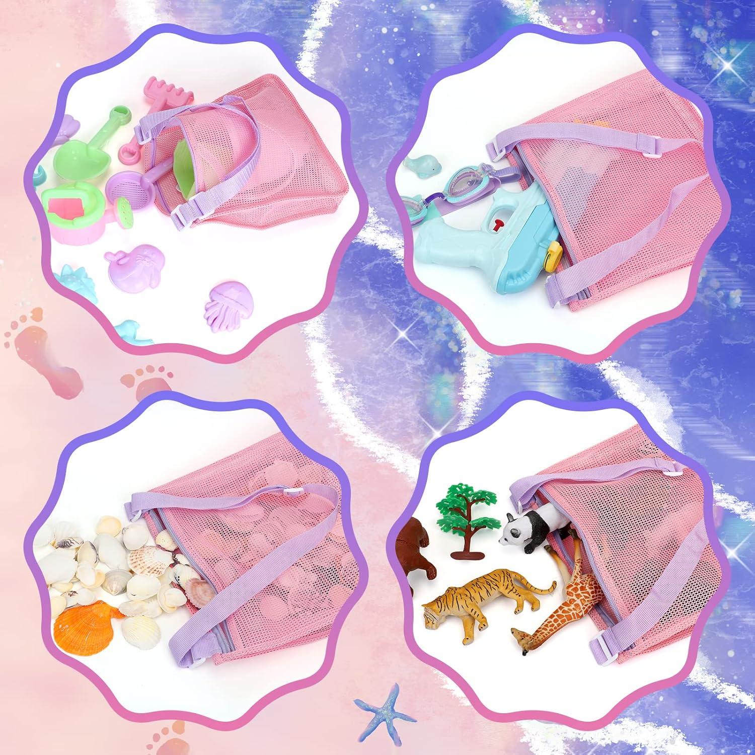 Tagitary Beach Toy Mesh Beach Bag Kids Shell Collecting Bag Beach Sand Toy Totes for Holding Shells Beach Toys Sand Toys Swimming Accessories for Boys and Girls(Only Bags,A Set of 3)(Blue+Pink+Light Green)