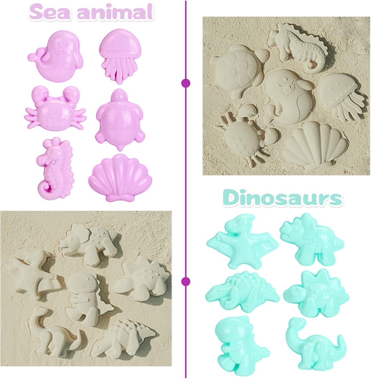 TAGITARY BEACH TOYS FOR KIDS: Including 1 beach shell bag, 1 watering can, 2 beach bucket, 4 shovel tool kits, 12 animal sand molds like crab, turtle, shell, seahorse, jellyfish, dinosaurs, etc. Various accessories meet all needs of kids